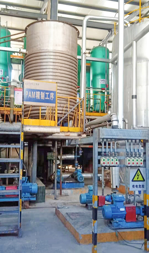 In terms of production technology, our company's current industrial chain starts with acrylonitrile, hydrolyzes to acrylamide, and then copolymerizes acrylamide with anionic monomers such as acrylic acid to produce anionic polyacrylamide, and cationic monomers such as DMC, DAC, etc. and cationic polyacrylamide, which lengthens the industrial chain and reduces product costs. The internationally advanced kettle polymerization process and azo-based polymerization initiation system are adopted to ensure the quality stability of the product.